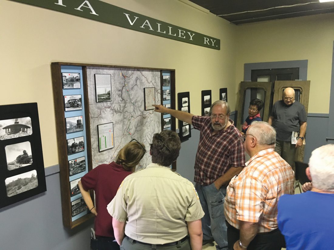 Times Observer Photo by Dave Ferry jim Bacon points to a map of the Tionesta Valley Railroad inside the old Depot station and Office building. A group with Chapman State Park’s Education Coordinator Jen Moore with Carly Moore listen in.