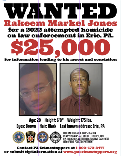 Pennsylvania State Police are looking for an Erie man accused of trying to kill a law enforcement officer in 2022. There is a $25,000 reward offered for information leading to the arrest of Rakeem M. Jones, 29. He is described as a black male, 6-feet tall, 175 pounds. Jones is accused of ...