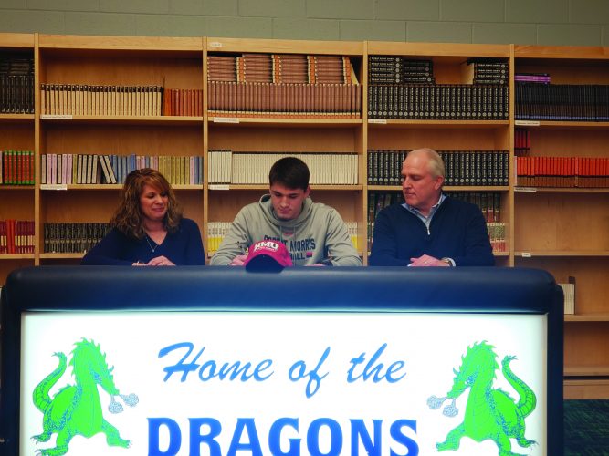 Warren Area High School senior Jake Kupchella signs his National Letter of Intent with Robert Morris University on Wednesday night at the WAHS library. Seated next to him are his mother, Pam, and his father, Brian. Kupchella had a decorated career for the Dragons as a quarterback, including ...
