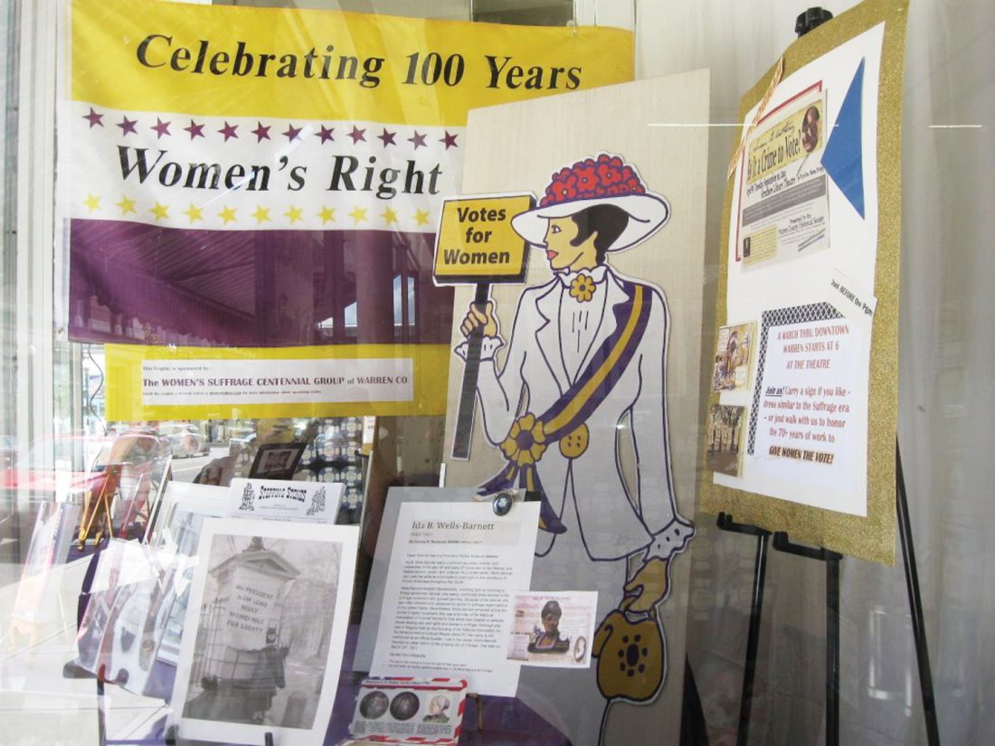 Currently, there are three businesses showcasing the Women’s Right to Vote, including Crone’s Drug Store, Stone Consulting, and Warren Antiques and Giftware. The store window displays were coordinated by Barbara Scott and Jane Dunshie, members of the Suffrage Celebration Group in Warren County.