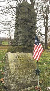 “By the 1930s, Fred was dependent on a monthly check from his generous brother, Arthur,” according to the Historical Society. “Fred spent his days quietly at home, but evenings found him at ‘his table’ in the Elks Club, drinking a spoonful of vinegar with each shot of whiskey and re-living the Spanish-American War with anyone who dropped by. In his declining days, his loyal housekeeper, Mrs. O’Connell, saw that he ate well and was comfortable. She recalled that as he dozed, he would sometimes call out plaintively for “Belle, Belle.” Once he sat up and shouted in his sleep, “Charge! Downhill! Downhill!”