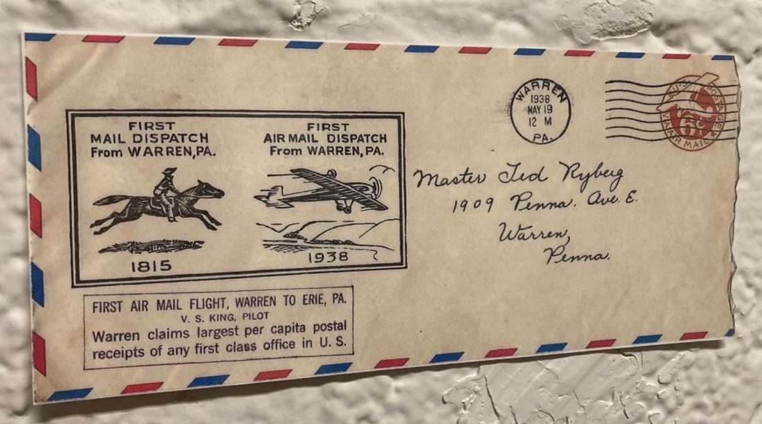 Photo courtesy of the Warren County Historical Society The first piece of Air Mail flown from the Warren Airport is in the collection of the Warren County Historical Society.