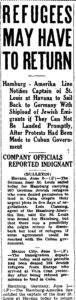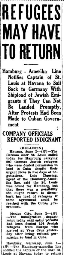 There were then two sub-headlines: “Hamburg-Amerika Line Notifies Captain of St. Louis at Havana to Sail Back to Germany With Shipload of Jewish Emigrants if They Can Not Be Landed Promptly, After Protests Had Been Made to Cuban Government” and “COMPANY OFFICIALS REPORTED INDIGNANT.”