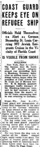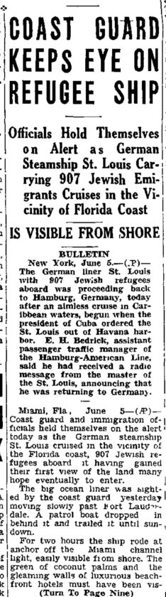 “Coast guard and immigration officials held themselves on the alert today as the German steamship St. Louis cruised in the vicinity of the Florida coast, 907 Jewish refugees aboard at having gained their first view of the land many hope eventually to enter,” the Associated Press story detailed.