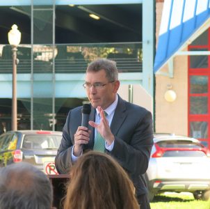 Department of Community and Economic Development (DCED) Secretary Dennis Davin was one of several speakers at a ribbon-cutting event held on Friday morning at the site of the Clark Street Development Project — the former Loranger building — at the base of Liberty St. in Warren.