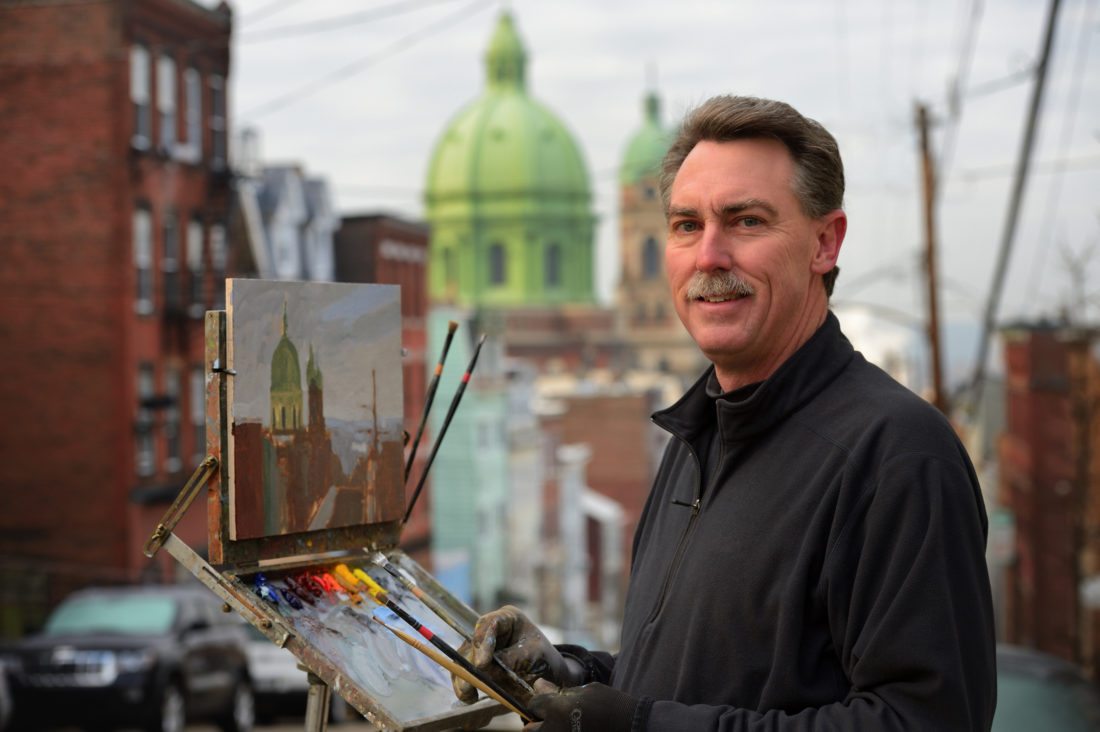 His series, “Grit and Grace,” is a collection of paintings from around Pittsburgh, which has become his home as well as his subject at large. “Finding beauty where generally people don’t find it,” said Donoughe, is his daily mission. And his efforts to elevate the everyday in the neighborhoods where he lives and frequents is his opportunity to help people to become “more thoughtful about where we live,” and to see those small moments and measures of beauty in the everyday bridges, alleyways, backyards, and byways of the places they call home.