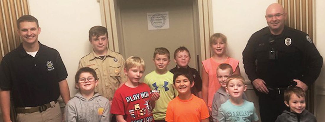 Photo submitted to Times Observer Cub Scout pack 782 visited the Warren City Police station recently. From left in front are Brody Connolly, Dominic McKee, Bentley Vincent, Owen Damcott, Issac Bleech, and Hunter Ganoe; and, in back, Community Service Officer AJ Foriska, Sawyer Lawson, Noah Bleech, Sebastian Lawson, Kayla McKee, and Officer Joe Bees.