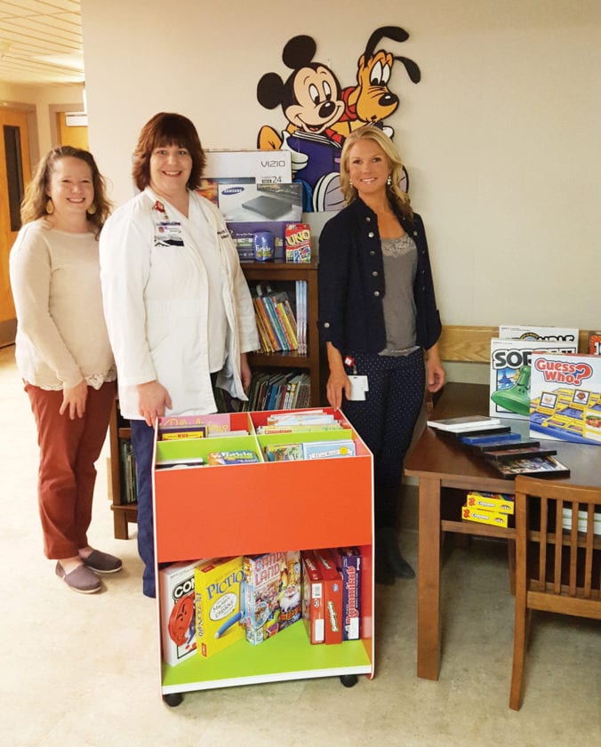 Photo submitted to Times Observer One of the benefactors of the Young Mothers Study Club (YMSC) of Warren’s 52nd Annual Charity Auction was the Pediatric and Maternity Ward at Warren General Hospital. The donation included a new television and dvd player, numerous dvds, a book cart with a set of books, board games, a new book shelf and kids table, baby swing, and foot stools for the waiting room. The YMSC looks each year for ways to better our community by donating back to children and their families. From left are Tristen Blair (YMSC past-president), Melissa Turner (nurse manager), and Lisa Siliano (maternity nurse and former club member).