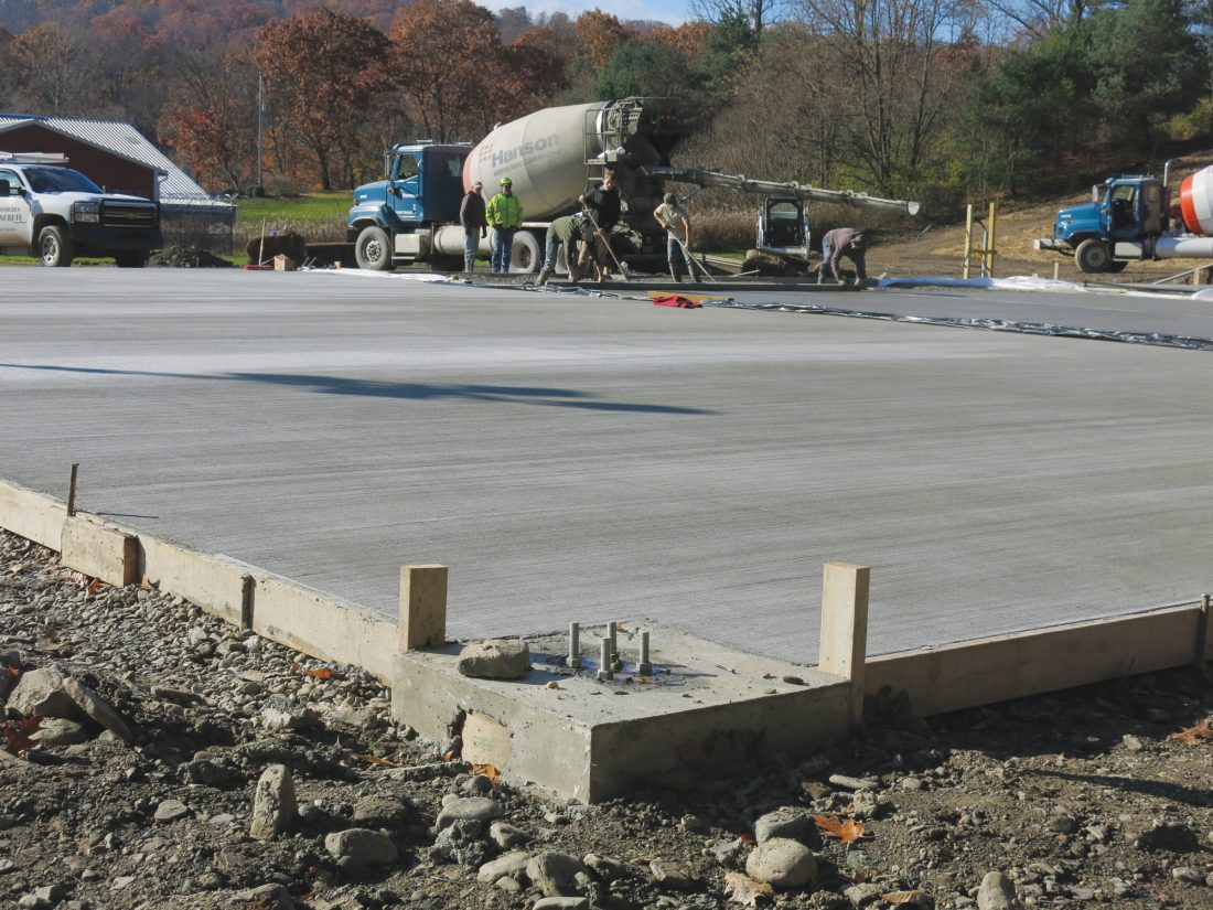 - Photo submitted to Times Observer Workers from Bloomgren Concrete of Lander pour some of the 125-feet by 75-feet of concrete for the HUB Sports and Arts Complex at Praise Fellowship on Monday.