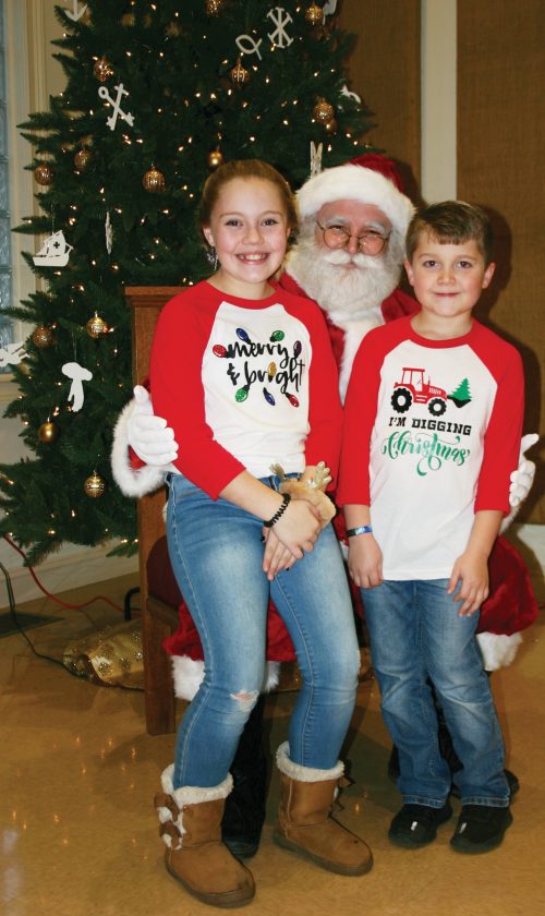Photos submitted to Times Observer Santa listened to the Christmas desires of children for presents at the Russell United Methodist Church, where refreshments were being served. Kendyll and Bodie Tome pose with Santa after relating their requests. Photo by Steve Horsley.