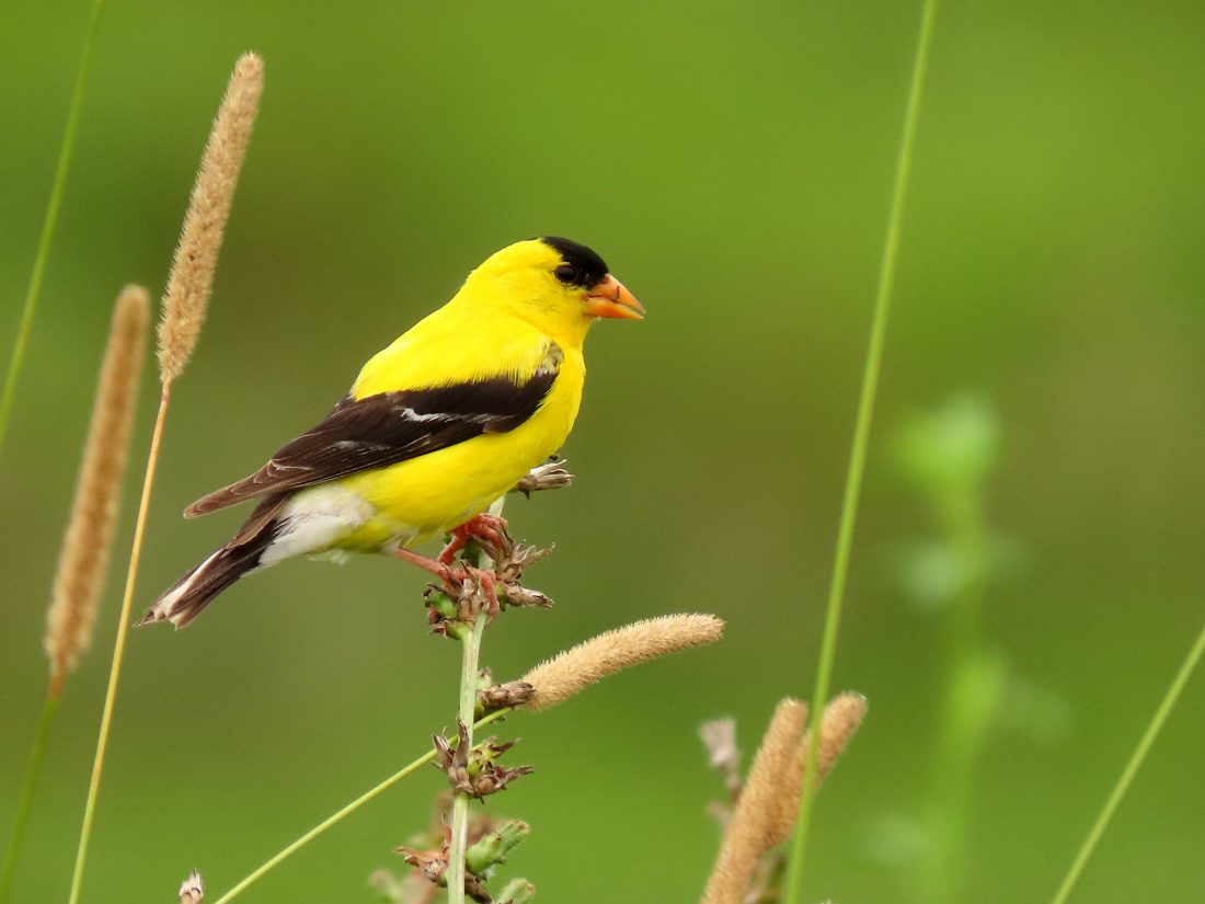 The American Goldfinch is one of the latest nesting birds in our area, not nesting until July or August. At this point in the summer most other songbird nestlings have fledged and are feeding on their own. But goldfinches do things in their own time. And there’s a reason. They time their mating with thistle plants going to seed. Goldfinches use thistle fluff to build their nests and thistle seeds, as well as other seeds, to feed their young.