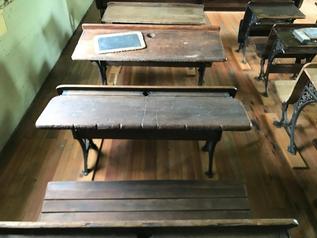 Pictured are the wooden desks from the one-room school at Scandia used by students in the 1800s. They are about a yard wide to accommodate two or three small children, which could facilitate tutoring of young children by an older student. These also saved space when enrollments suddenly increased.