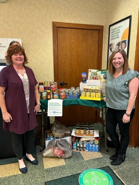 Teller Team Lead Barb Fox, left, and Office Manager Krista Fitzsimmons — both with the Jackson Run Road branch — show some of the donations already received.