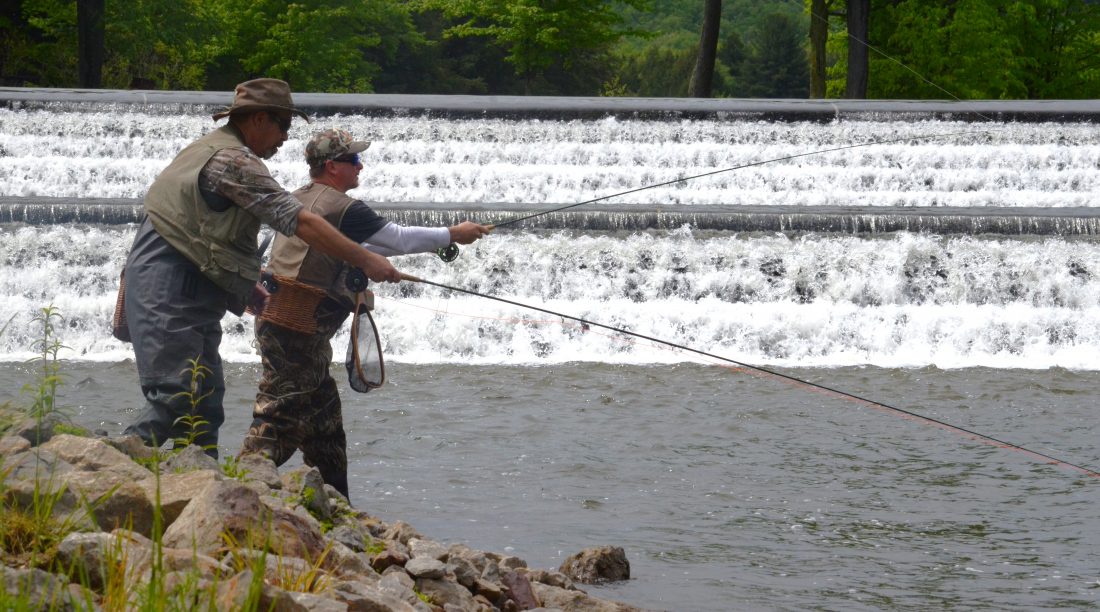 Herb Burkey (left) of Mead Township fishes with Andrew Morell, formerly of Warren County, now living in New Hampshire, in the tailwaters of the dam at Chapman State Park.