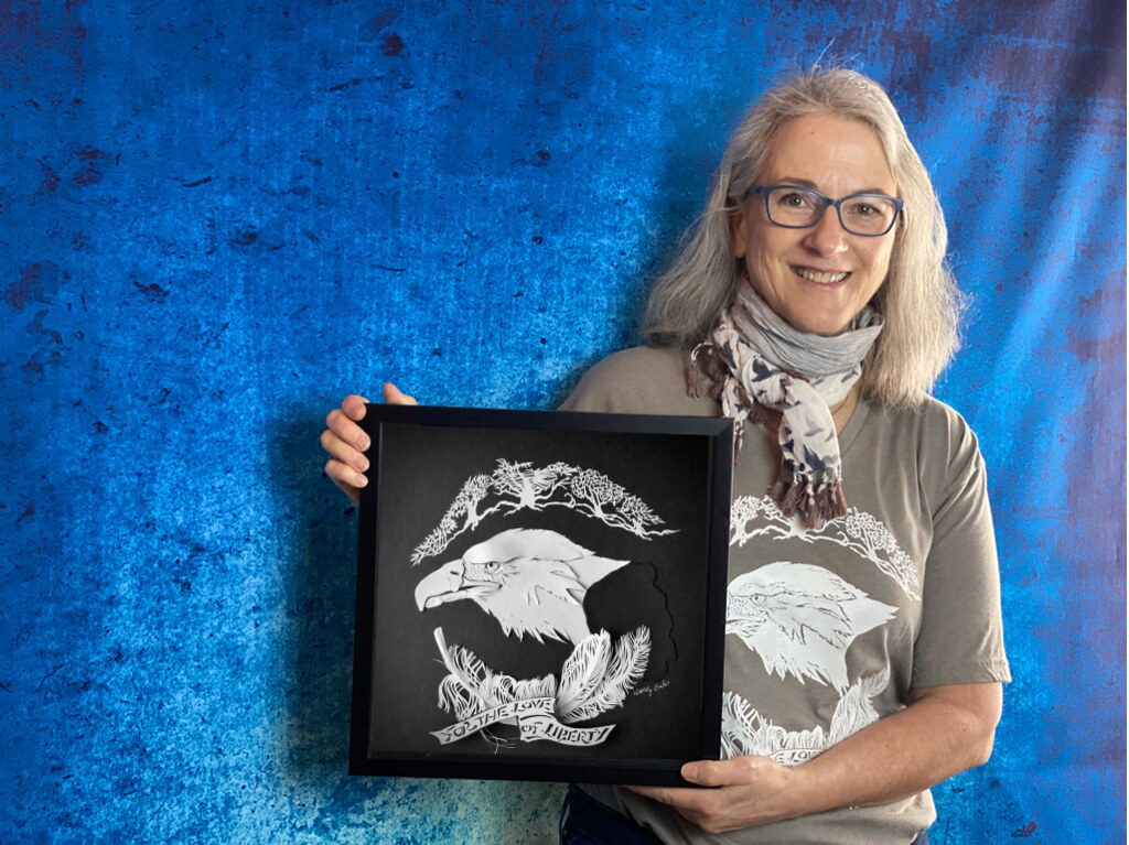 Submitted Photo Cut paper artist Wendy Bale is pictured with her framed work of Audubon Community Nature Center’s Bald Eagle, Liberty. Bale is donating her art as a fundraiser for Audubon.