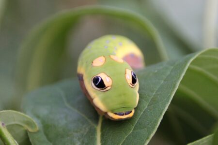 Photo by Jeff Tome Older Spicebush Swallowtail caterpillars mimic the large eyes of a snake to deter predators.