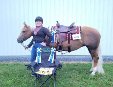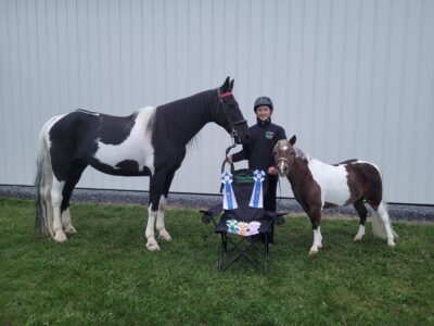 Arlene Boisvert with Iceman, 1st Saddle Seat Pleasure, 1st Saddle Seat Equitation 8-13, 3rd Open Trail Horses 8-13, and with Nugget, 5th Miniature Horse Jumping 8-13 and 6th Miniature Horse In Hand Trail 8-13.