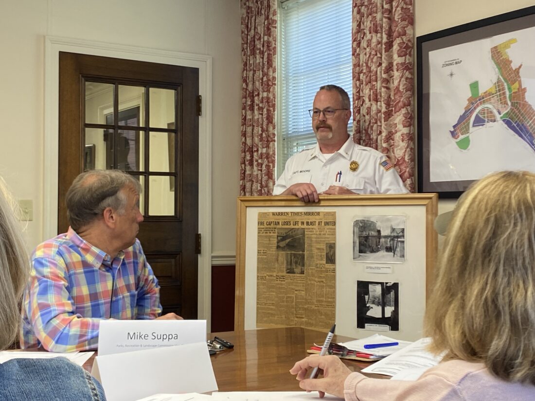 - Times Observer photos by Josh Cotton City of Warren Fire Captain Andy Moore makes a pitch for a firefighters memorial during Tuesday’s Parks, Recreation & Landscape Committee meeting.