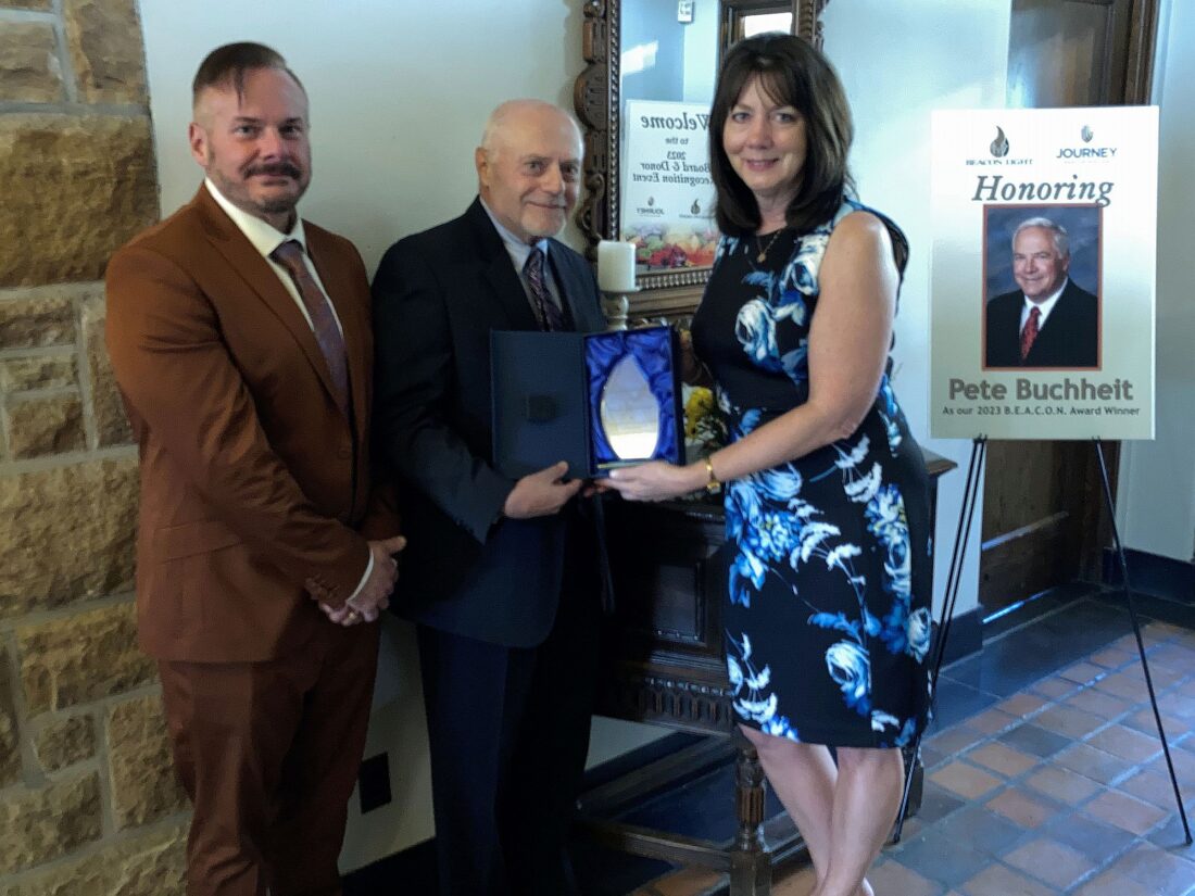 Guy Signor, left, president/CEO of Journey Health System and Gregory LaRocca, chairman of the board, present Karen Buchheit, the wife of Pete Buchheit. Buchheit was recognized posthumously with the 10th annual B.E.A.C.O.N Award during an event held earlier this month in Bradford. B.E.A.C.O.N. stands for Being an Enthusiastic Advocate for Community and Organizational Needs and is awarded each year to an individual who exemplifies service to the Beacon Light companies. From 2010 to 2021, Pete served on the Journey Health System and Beacon Light Adult Residential Services Board of Directors. Buchheit also served on Journey Health System’s Finance Committee, Executive Board Committee and the Strategic Planning Committee. He was an active member of these boards and the community at large.