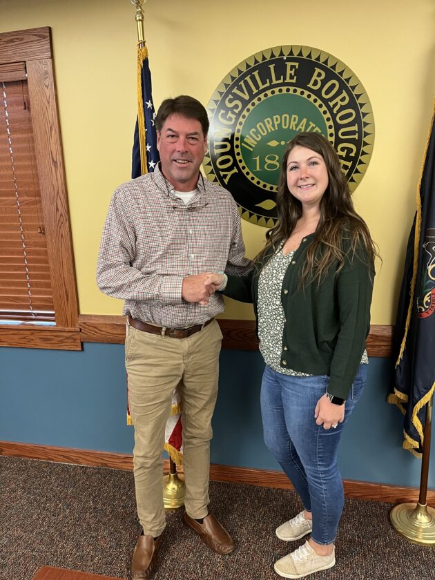Seneca Generation recently made a donation of just $9,000 to the Youngsville Police Department so YPD could obtain updated equipment in the form of police grade tasers. In the photo, from left, are Youngsville Police Chief Todd Mineweaser; Kellie McClement, plant administrator at Seneca Generation; David Meyerotto plant manager at Seneca Generation and Sgt. Ben Leach.
