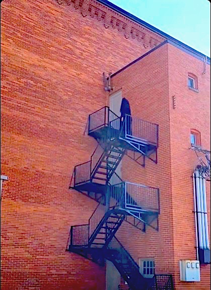 Screenshot from Struthers Library Theatre video The Woman in Black is pictured on the fire escape outside the Struthers Library Theatre. The theatre will present The Woman In Black starting Oct. 30 through Nov. 2