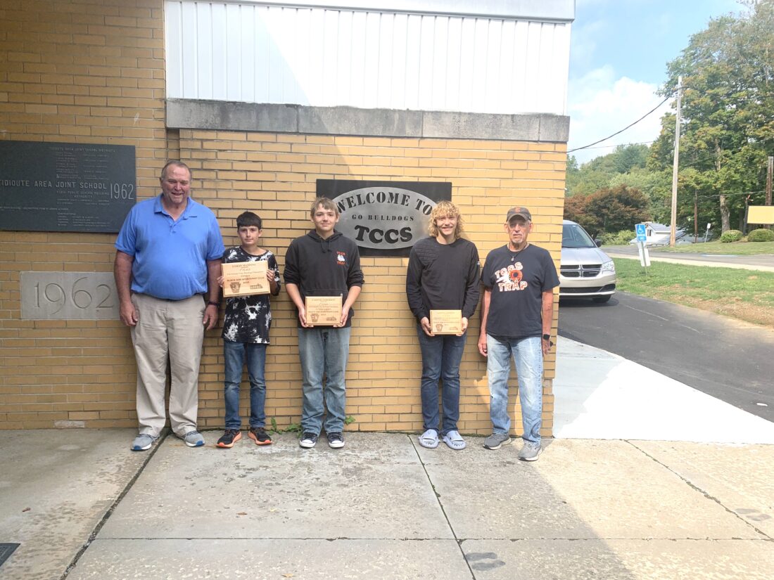 Students from Tidioute Community Charter School Trap Team brought home winning placements in the 3rd Annual Clay Busting Champions Black Ash Sportsman Club. The Pennsylvania Game Commission put on the Black Ash Tournament which is a sporting clays competition. Several area schools are invited to participate at the tournament which takes place at the Guys Mills Sportsman’s Club in Guys Mills, Pa. Pictured from left are Coach Tony Shirey with students Ethan Manning, first place in the novice division; Carter Anderson, second place in the junior varsity division; Landon Anderson, third place in the varsity division; and Coach Ken Anderson.