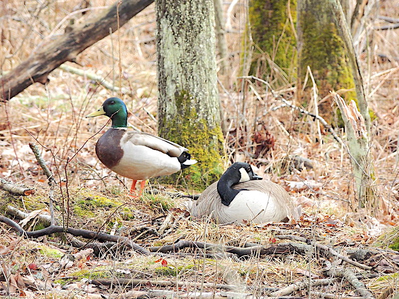 Mallards and geese both spend time on the shores of ponds, and nest on land. Like the two pictured in this photo.