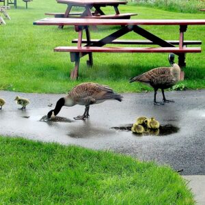 Shown are Goslings practicing being dabbler and puddle jumpers. Canada Geese spend a lot of time on land with their goslings.