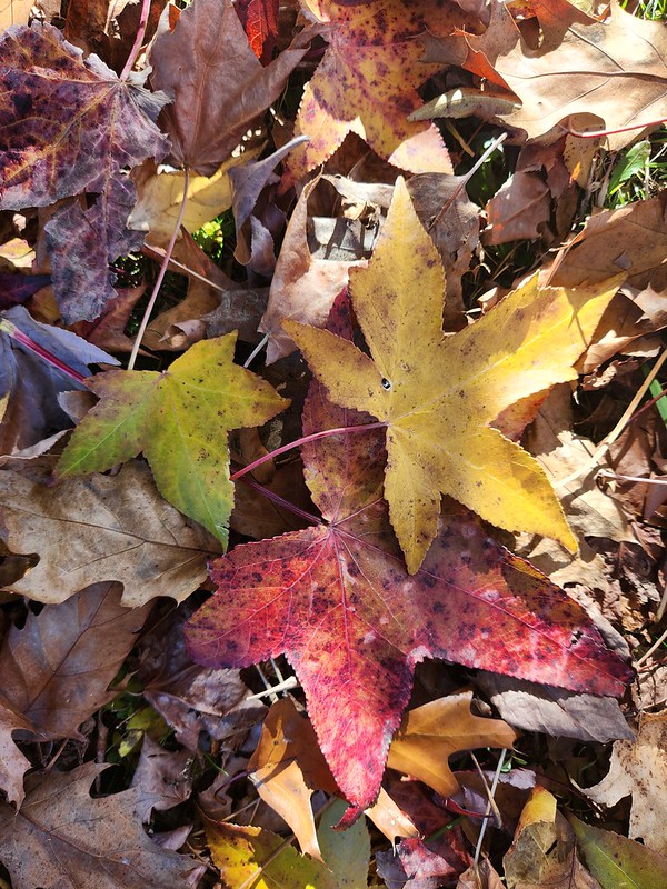 Early November showcases the American Sweetgum leaves, a personal favorite, still holding on to their rainbow of color. Sweetgum trees often lose their leaves later than many other deciduous trees, and they demonstrate a riot of color before they do. The star-shaped leaves turn deep reds and purples, vibrant yellows, and the occasional oranges; each leaf you look at has its own unique tie-dye coloration and they are just as pretty on the ground as they are on the trees.