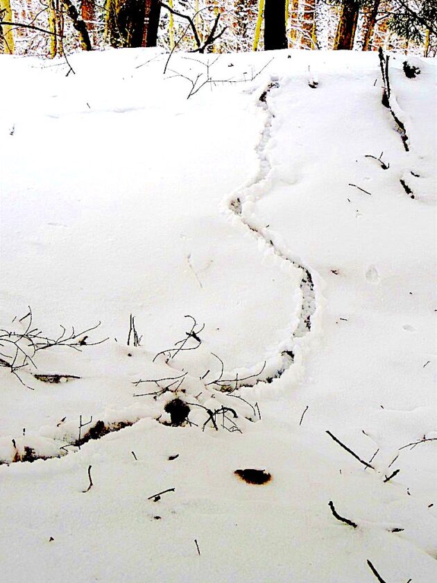 Photo by Katie Finch Melting snow uncovers tunnels made by creatures in the subnivean zone, such as shrews and voles.