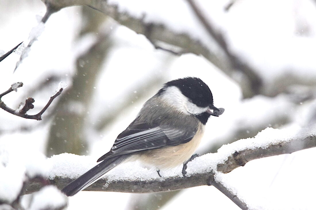 Photo by Charlotte Schmaltz A Black-capped Chickadee holds a seed in its beak.