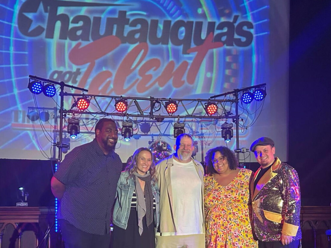 Submitted Photo From left Chautauqua’s Got Talent Judge Steve Davis, CGT Co-producer Ylsa Maj, 2025 CGT Champion Dewayne Moore, CGT Judge Jamie Lee, and CGT Co-producer Angelo Valentino celebrate Moore’s win.