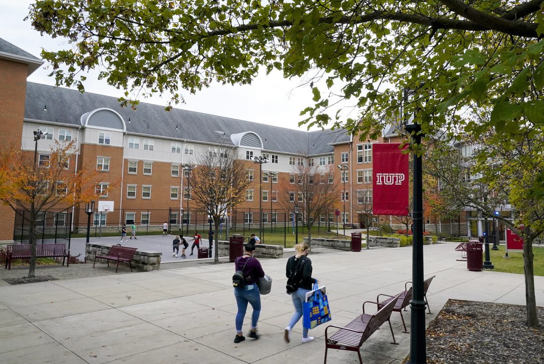 FILE - Students walk on the campus of Indiana University of Pennsylvania in Indiana, Pa., Oct. 21, 2020. The Biden administration on Wednesday, Dec. 22, 2021, extended a student loan moratorium that has allowed millions of Americans to put off debt payments during the pandemic. Under the action, payments on federal student loans will remain paused through May 1, 2022. (AP Photo/Gene J. Puskar, File)