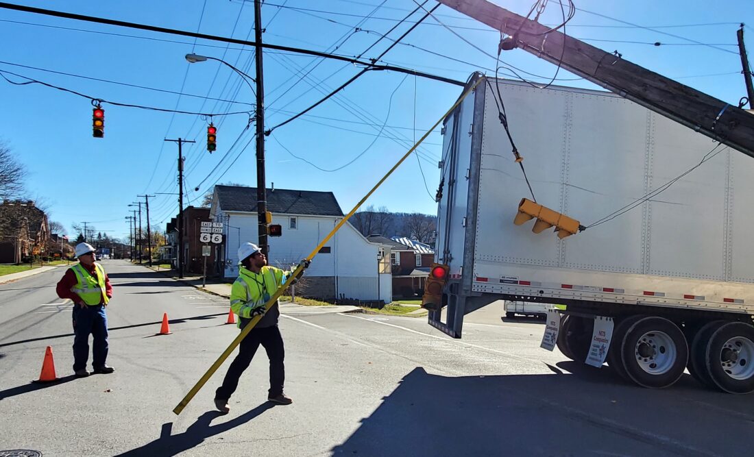 The westbound truck made a legal left turn onto South South Street, but the trailer snagged overhead wires. The wires in turn pulled down a utility pole at the southwest corner of the intersection.