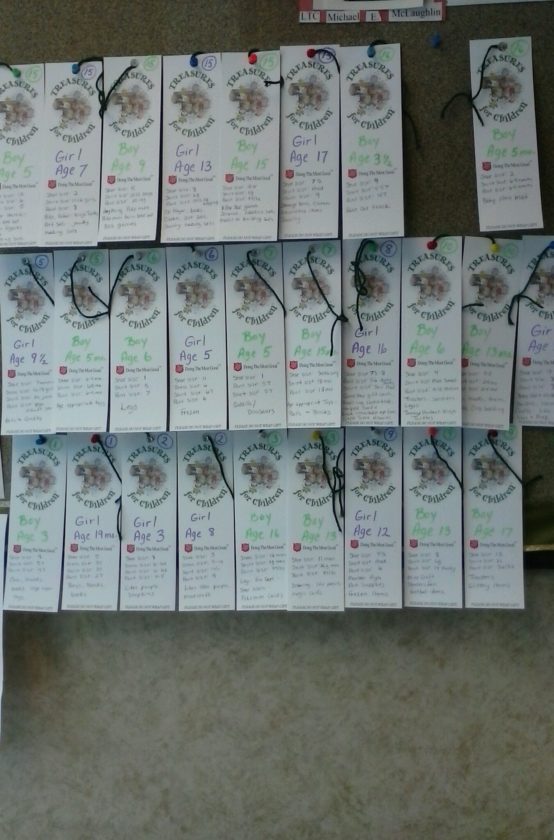 These tags only have the age of the child, sex, and what they want for Christmas, names and identity are only know by Jennifer who numbers the tags so she can match them up with the application and get them to the proper families.