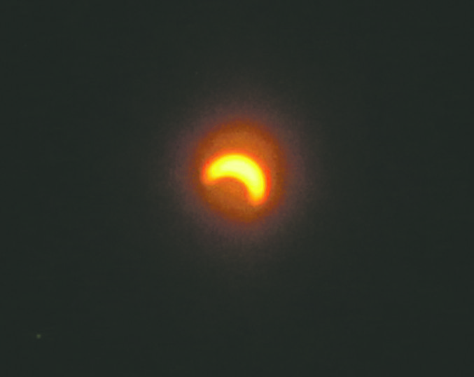 The glasses allowed viewers to look safely directly at the sun. At the peak, they saw a fairly thin, orange crescent. Without the glasses, it was hard to tell anything unusual was happening — the sky was not so dark that the stars came out — other than by looking at the sun — a very bad idea.