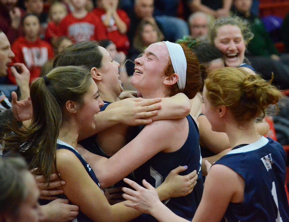 The Warren Area High School girls basketball team celebrates moments after the Dragons’ 59-44 win over Slippery Rock in the District 10 Class 5A championship game on Saturday at Meadville High School. The win marks the second D-10 crown in program history. The Lady Dragons will meet Oakland Catholic in the first round of the PIAA playoffs this Saturday. For complete coverage, see Page B-1.