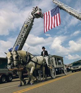 Times Observer photo by Brian Ferry A horse-draw carriage carries the casket bearing the body of Jerry Borden down Main Street in Sheffield beneath a flag hung from two ladder trucks as an honor to a fallen brother.