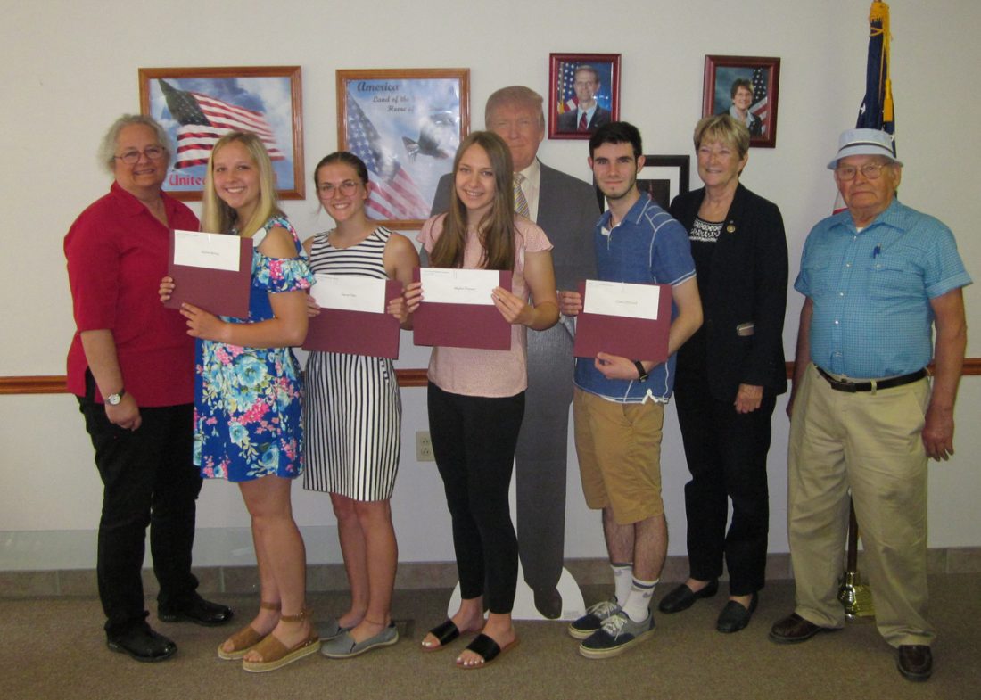 The Warren County Republican Committee awarded Emory J. Mahan Memorial Scholarships to graduating seniors in the Warren County School District. From left are: Republican Committee Chairperson Kathy Kemp-Jensen, Madison Mohney (Eisenhower High School), Naomi Hahn (Warren Area High School), Meghan Peterson (Warren Area High School), Carter O’Donnell (Sheffield Area High School), State Representative Kathy Rapp, and Scholarship Committee Chairman David White. Each student received a $1,000 scholarship. The scholarship was established in memory of Mahan in 2011 in recognition of his efforts on behalf of the Warren County Republican Committee and the procurement of the headquarters building. The intent of the scholarship is to make seniors more aware of the political process and the need for community involvement. Applicants answer an essay question based on current political events. Since the scholarship’s inception in 2013, the committee has awarded $27,000 to area graduates.