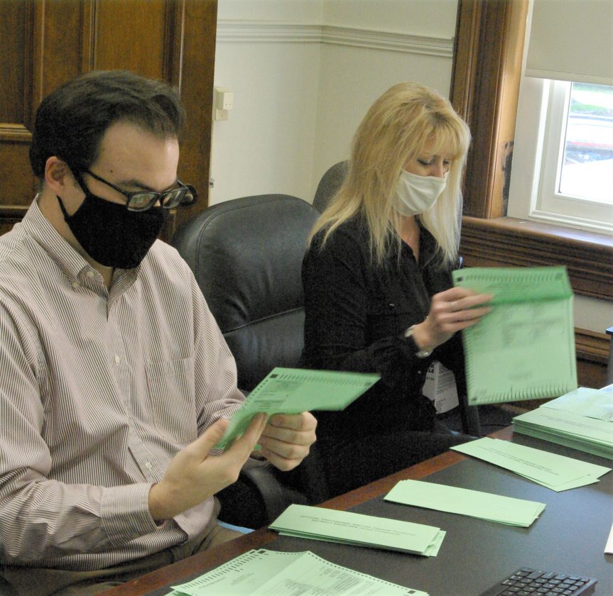 Times Observer photo by Brian Ferry Warren County Commissioners Jeff Eggleston and Tricia Durbin open provisional ballots Monday as part of their responsibilities as members of the board of elections.