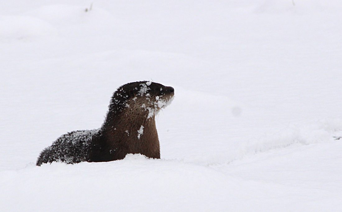 A River Otter does what it always does in the snow, plays!
