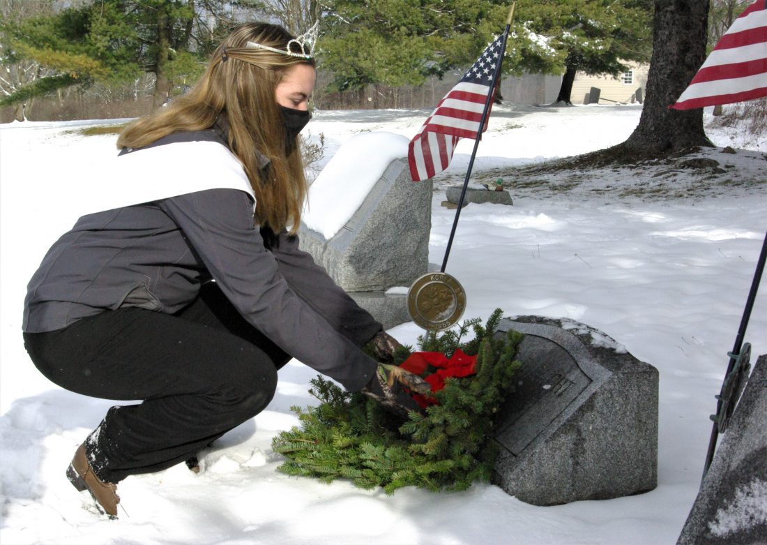 Times Observer photo by Brian Ferry Warren County Dairy Princess Madison Sleeman places a wreath on a veteran’s grave at Wesleyan Cemetery Saturday during Wreaths Around Sugar Grove, Wreaths Across America.