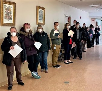 Photo submitted to Times Observer A line of staff members at the Rouse Home wait for the COVID-19 vaccine Monday.