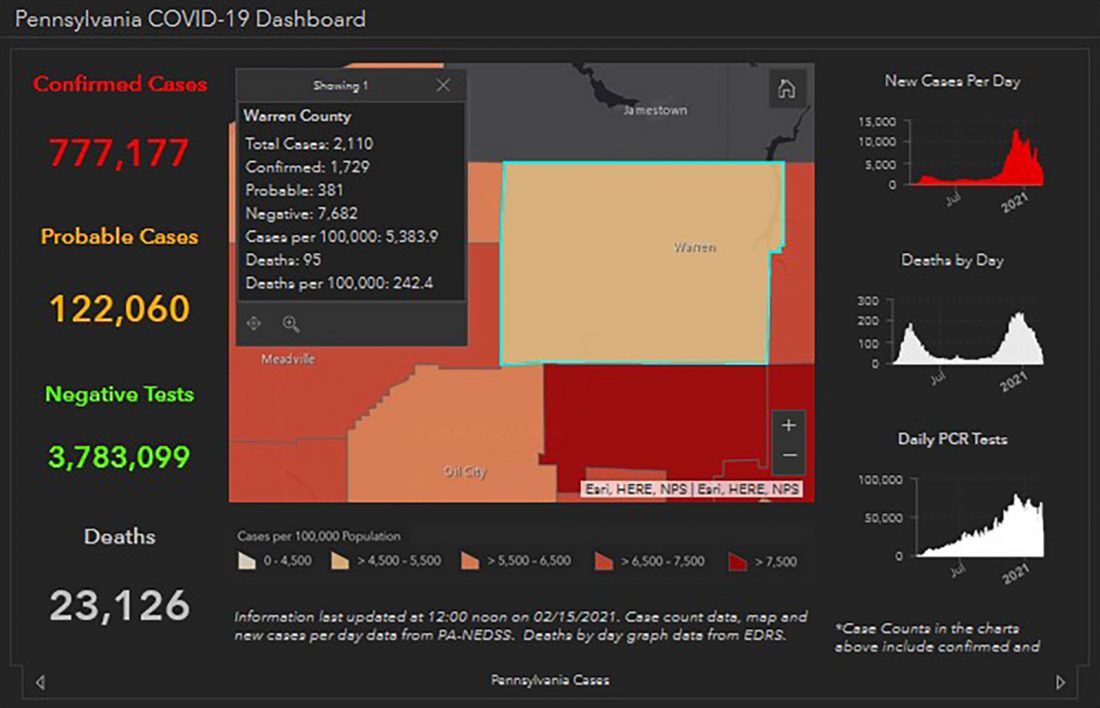 The Pennsylvania Department of Health’s latest statistics show a total of 2,110 cases so far in Warren County. That is five more than the 2,105 reported on Sunday. There was no update on Monday due to Presidents Day.