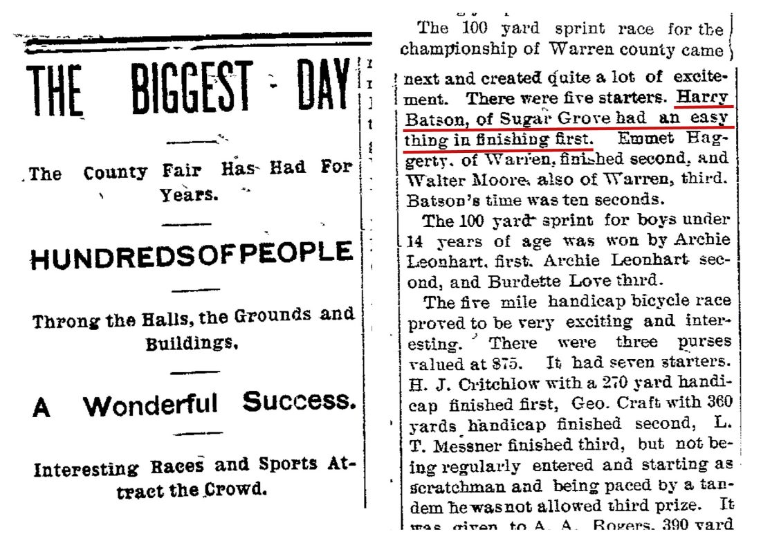 - Photo from the Sept. 17, 1898 Warren Ledger This clipping from Sept. 17, 1898 tells of Batson’s triumph in a 100 yard dash at the Warren County Fair.