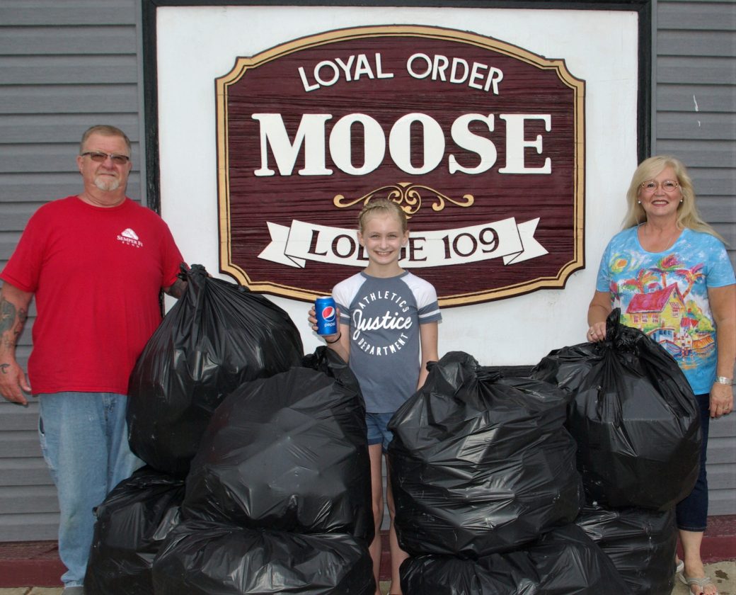 Times Observer photo by Brian Ferry With the help of the Loyal Order of Moose Lodge No. 109 of Warren, Lexi Gulnac of Warren is collecting cans as a fundraiser for her week at a Science, Technology, Engineering, and Technology camp at LaRoche College in Pittsburgh. Pictured with an initial batch of eight bags of cans, are (from left): Moose Treasurer Tom Jackman, Gulnac, and Moose Administrator Tina Nary.