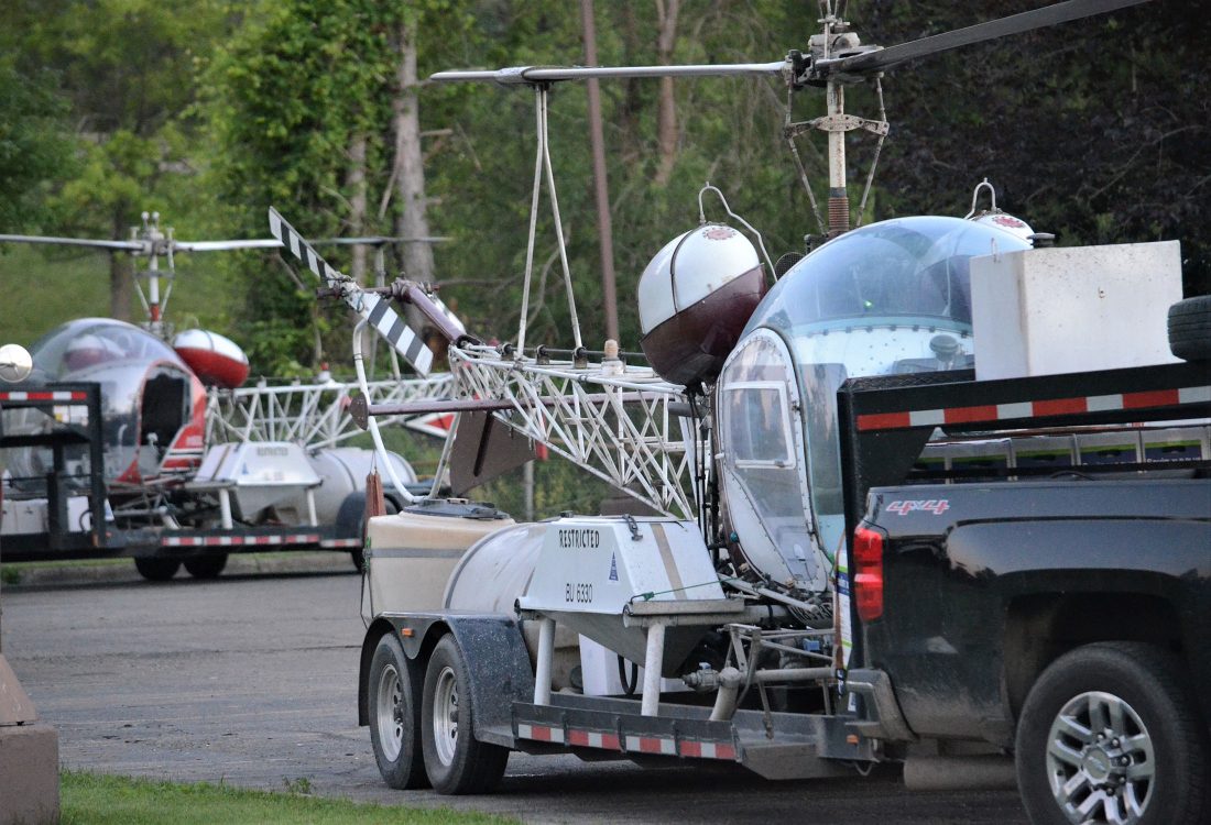 Two helicopters from Tallman Aerial Spraying of Dauphin spent the night there on the backs of trucks. According to John Tallman, his company was hired to do late season gypsy moth spraying on some high-value timber on private land in the area.