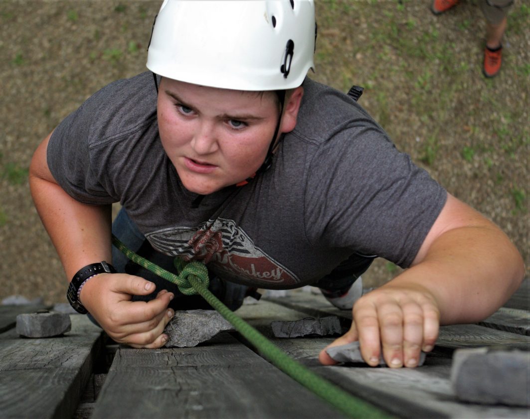 Above, Jacob Sleeman of Troop 17 of Sugar Grove shows his determination during a climb to the top of the tower at Camp Olmsted Thursday at Scout Camp. Below, Derek Guiher of Troop 17 of Sugar Grove uses an acetylene torch to sweat solder silver onto his neckerchief slider Thursday at Scout Camp.