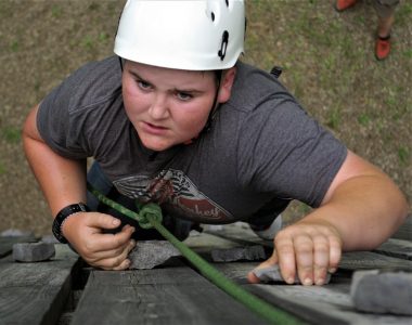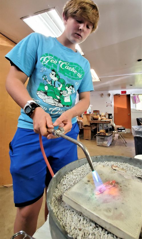 - Above, Jacob Sleeman of Troop 17 of Sugar Grove shows his determination during a climb to the top of the tower at Camp Olmsted Thursday at Scout Camp. Below, Derek Guiher of Troop 17 of Sugar Grove uses an acetylene torch to sweat solder silver onto his neckerchief slider Thursday at Scout Camp.