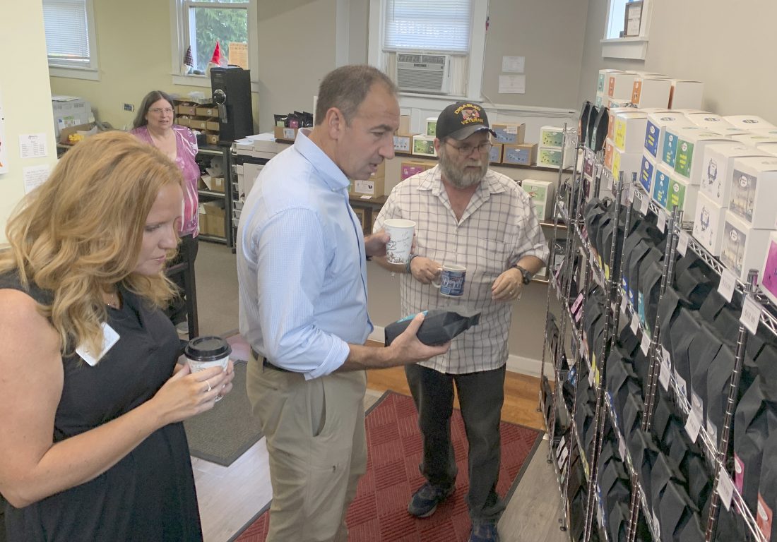 Times Observer photo by Josh Cotton Bob Willman, right, walks Commonwealth Court candidate Stacy Wallace, left, and U.S. Senate hopeful Jeff Bartos, through White Cane Coffee’s offerings during a meet and greet held at the shop Tuesday morning.